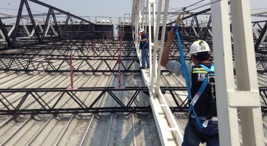 Suministro e instalación de 176 tramos de líneas de vida horizontal Travsmart® marca Tractel® para la cubierta del Estadio de Béisbol de los Diablos Rojos de México. Sumando un total de 5,500.00 m de línea de vida.